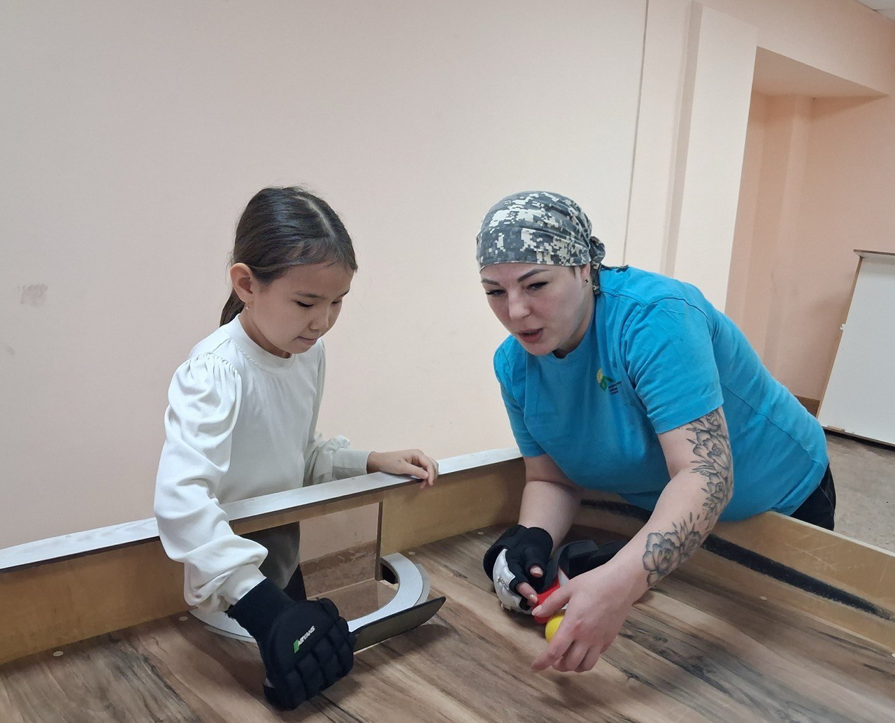 Организатор спортивно‑массовой работы Раян Колбаев начал с подробного рассказа о правилах игры. Затем он продемонстрировал специальное оборудование: теннисный стол, ракетки, маски на глаза и звуковой мяч. Чтобы ребята могли воочию увидеть, как проходит игра, члены ВОС провели показательный сет.