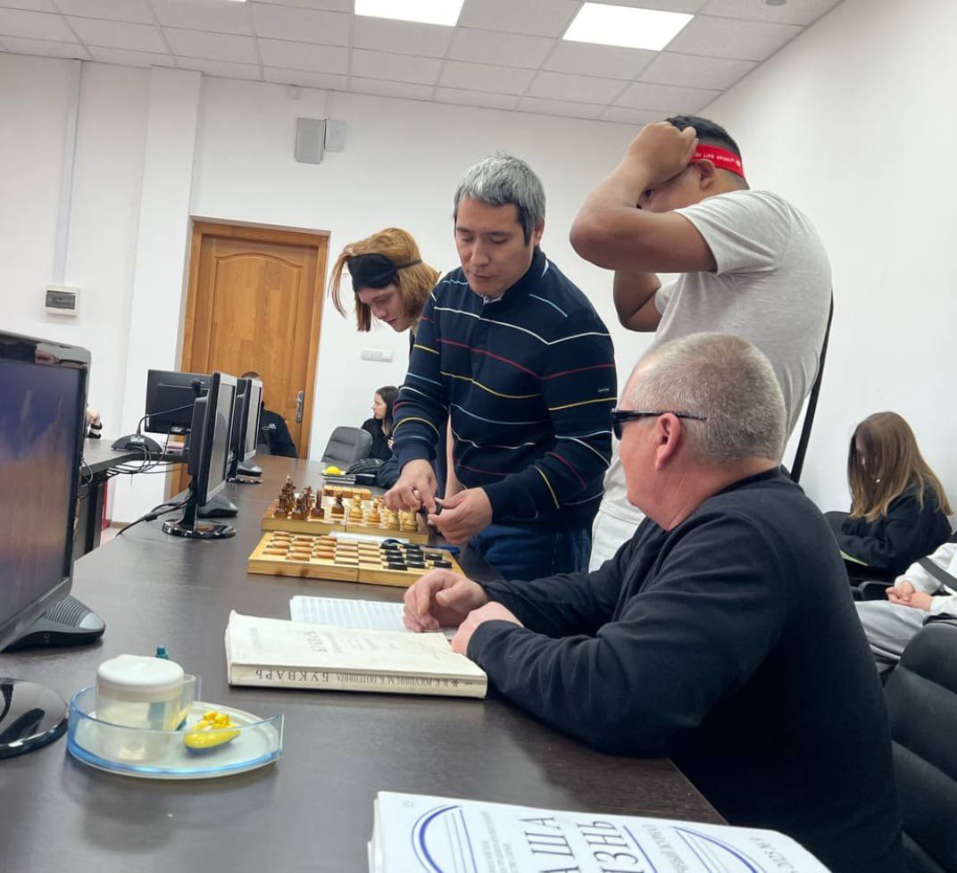 Александр Каюпов познакомил участников с адаптированными настольными играми для незрячих и даже сыграл в шахматы с теми, кто решился закрыть глаза.